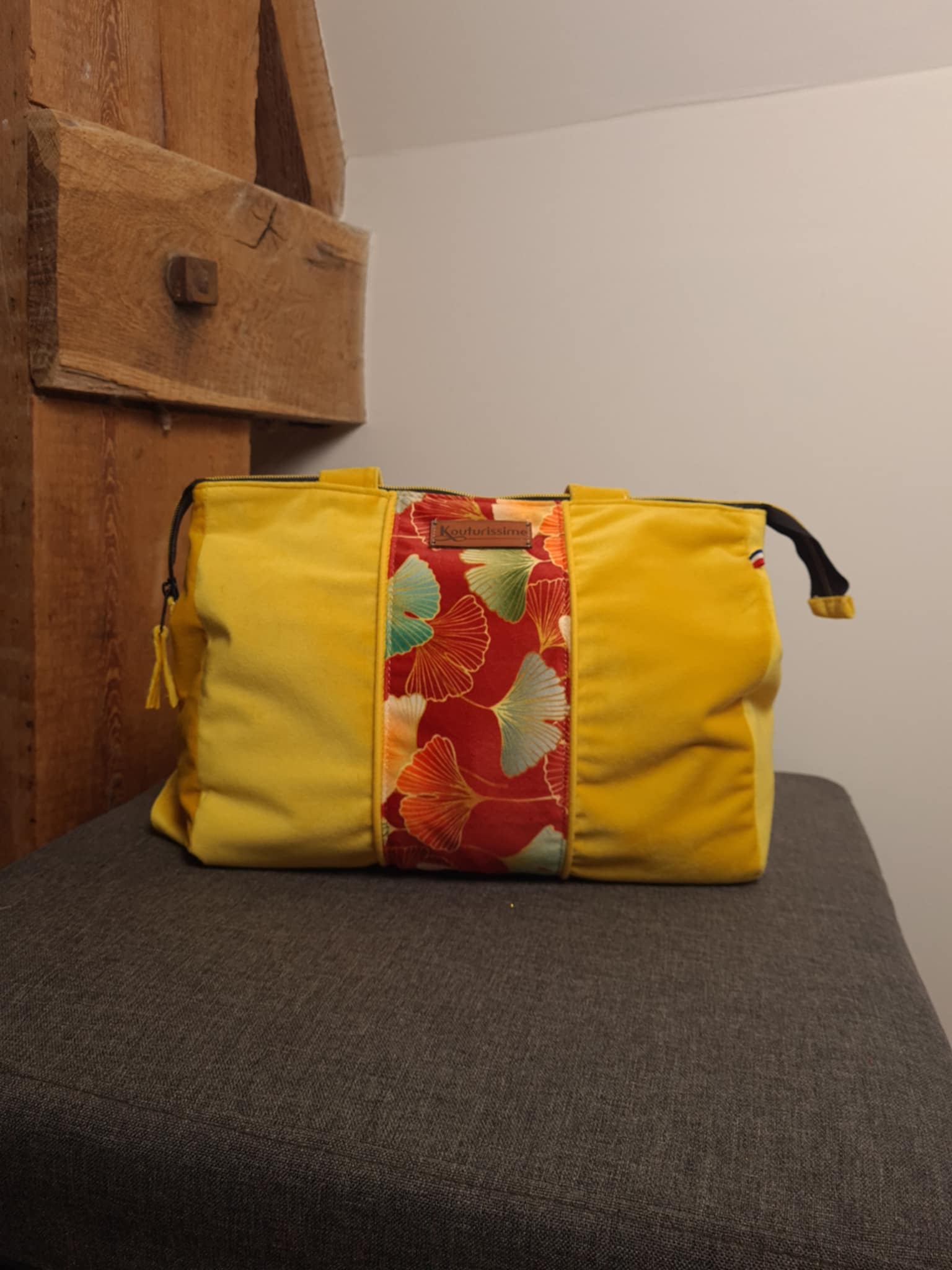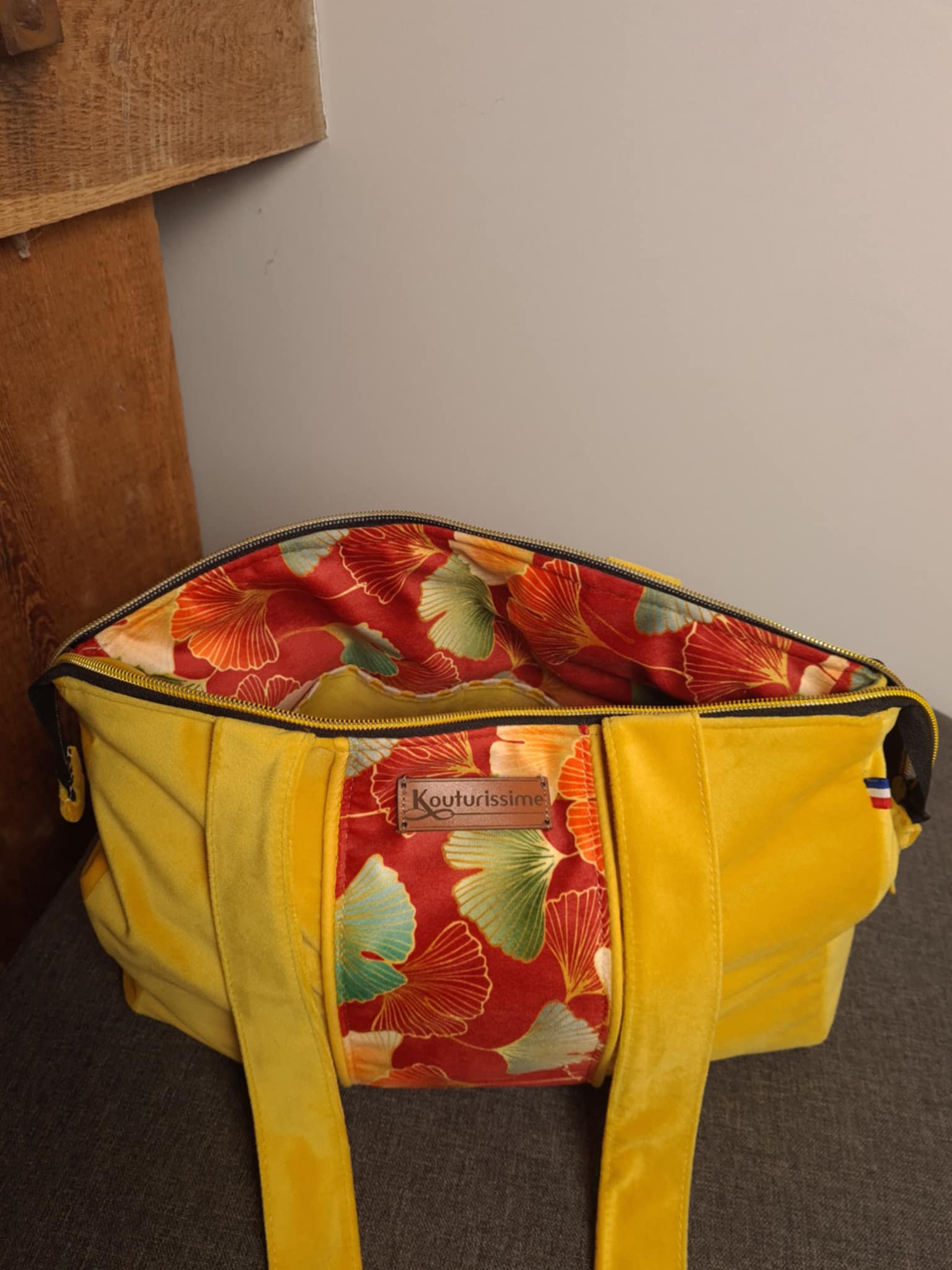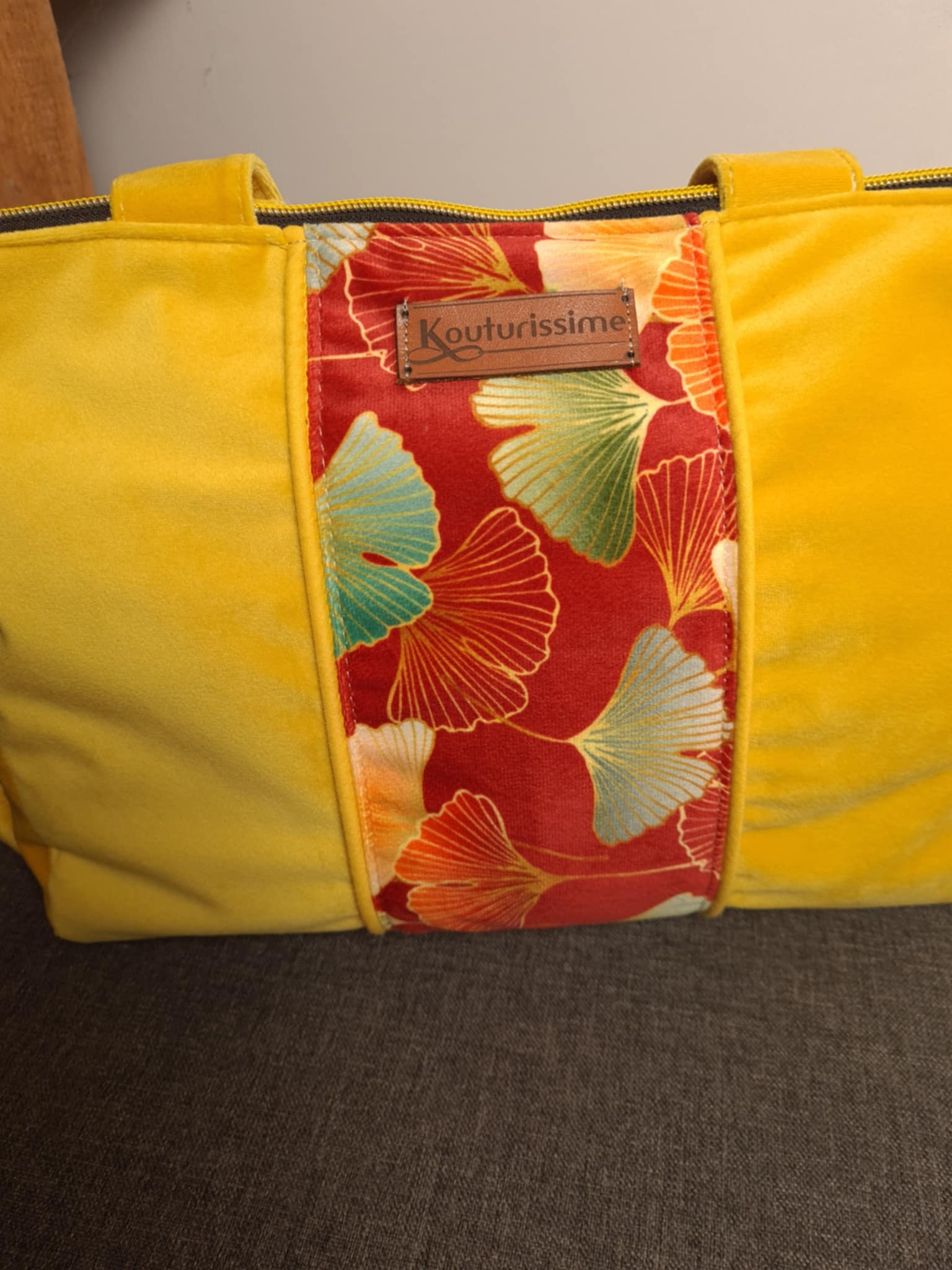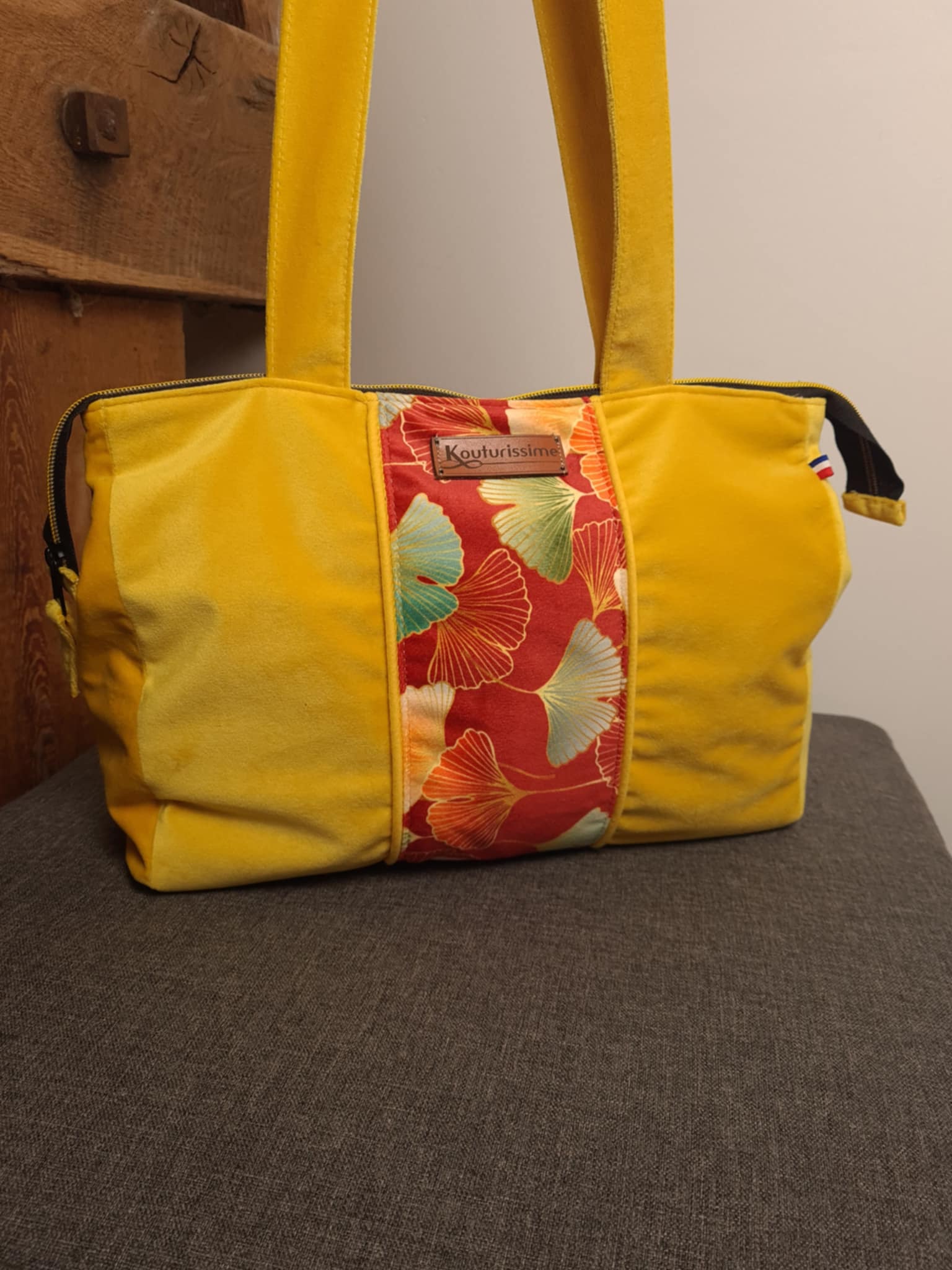Sac à main avec grandes anses, en velours ras jaune et velours ras fleuri assorti, fermé par zip, grande contenance, poche compartimentée, création unique et personnalisée, entièrement réalisée dans mon atelier de Loire Atlantique.