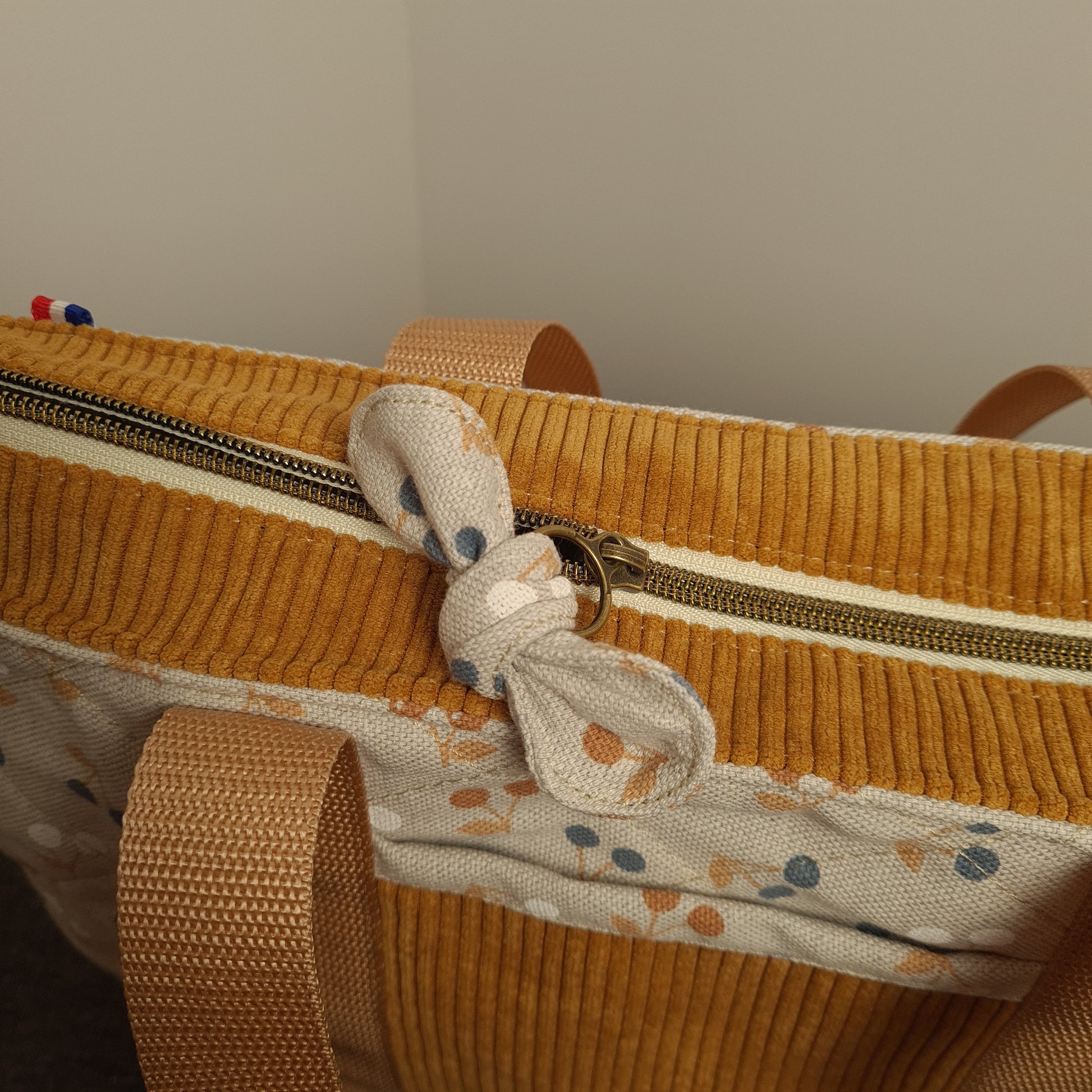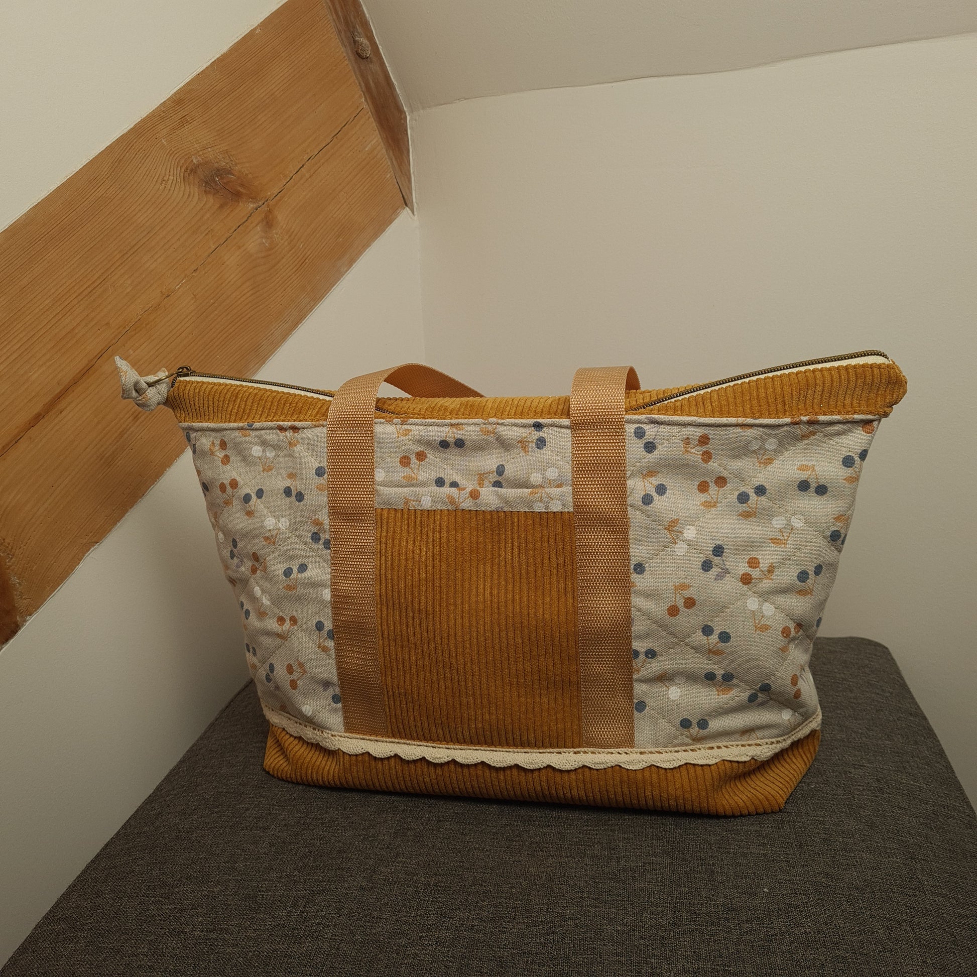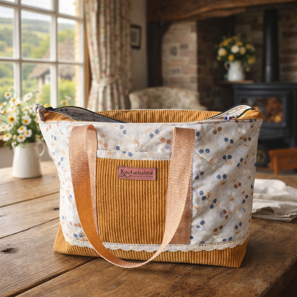 Un cabas élégant et chaleureux, mêlant la douceur du velours et un tissu imprimé délicat pour accompagner le quotidien avec style.